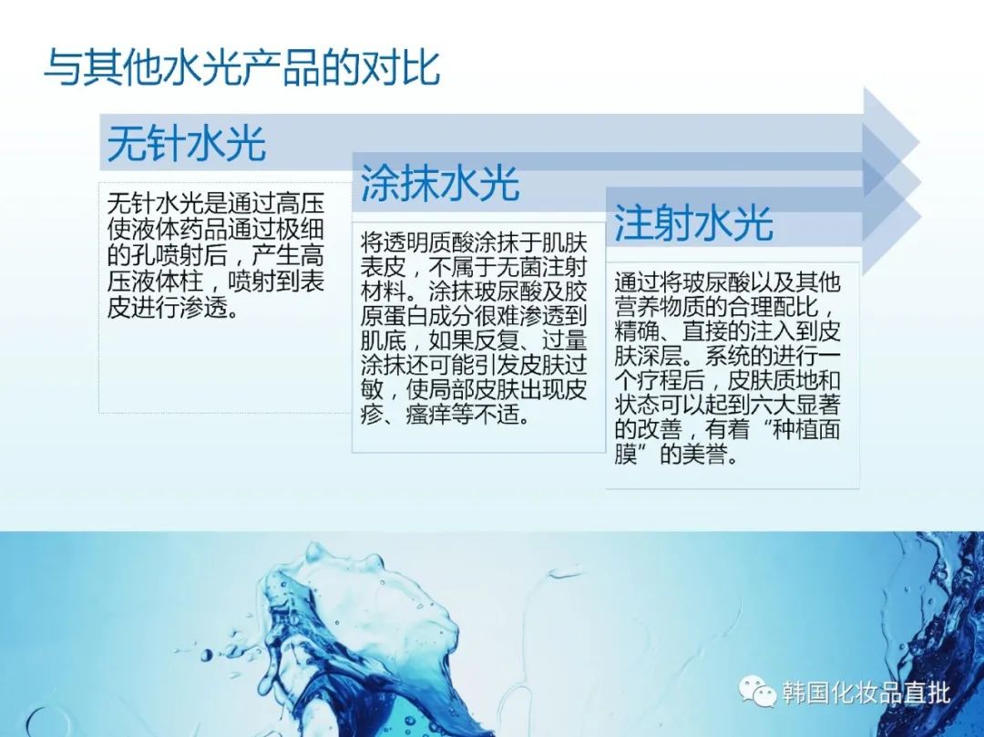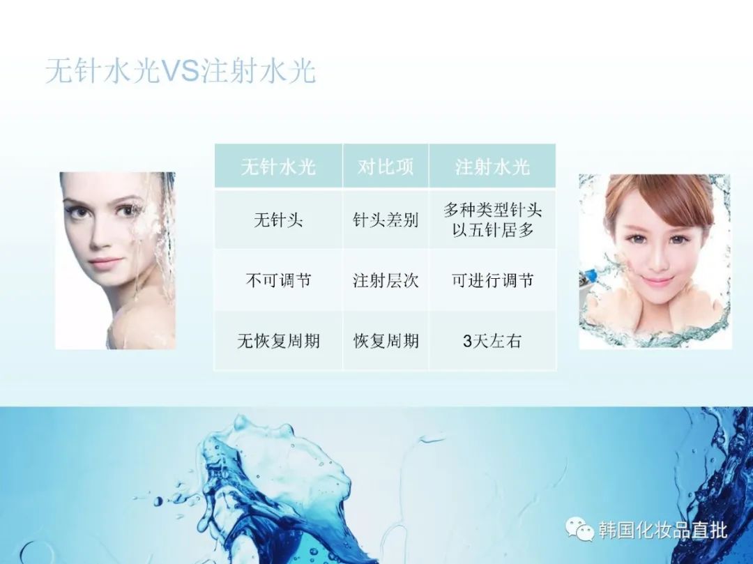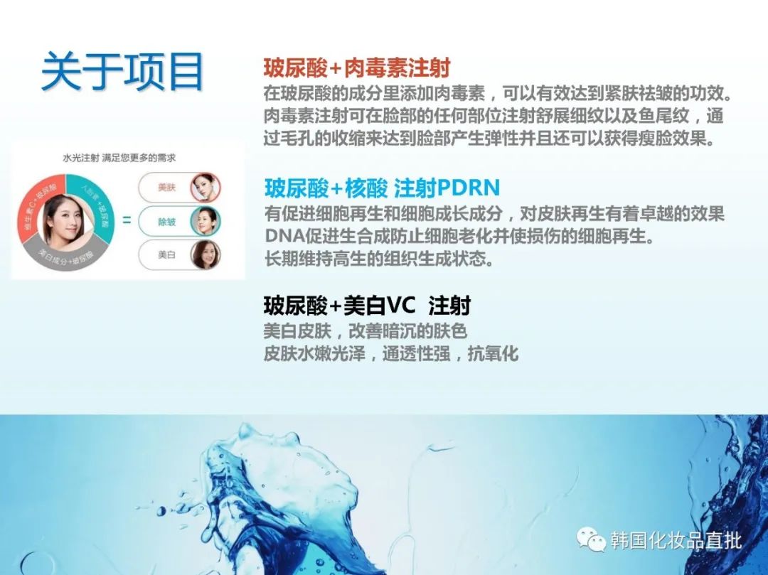 Water mesotherapy is to inject hyaluronic acid into skin. Hyaluronic acid contains moisture, 200-300 times as rich as one's body. So that it makes the skin smooth, soft, bright and hydrated after the injection. In order to keep the skin hydrated, ladies always choose varied skin care products. Actually, skin care products only hydrate moisture on the cutin. So that over smearing those products cannot deeply provide moisture for the skin. As we know, acne, wrinkle and inelasticity would appear if skin lacks moisture. Water mesotherapy will solves all the problems by reason of lacking moisture, such as sallow skin, color spot, wrinkle… And it will supply moisture for dermis. Therefore water mesotherapy works well on whitening, moisturizing and renewing inelasticity.