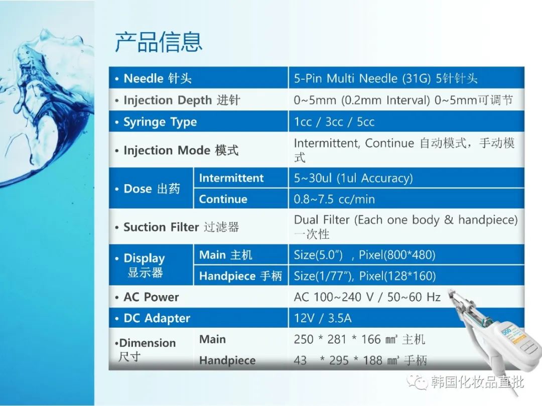 Needle 针头5-Pin Multi Needle (31G) 5针针头Injection Depth 进针0~5mm (0.2mm Interval) 0~5mm可调节Syringe Type1cc / 3cc / 5ccDose 出药Intermittent : 5~30ul (1ul Accuracy)Continue : 0.8~7.5 cc/minSuction Filter 过滤器Dual Filter (Each one body & handpiece) 一次性Display 显示器Main 主机 : Size(5.0”) , Pixel(800*480)