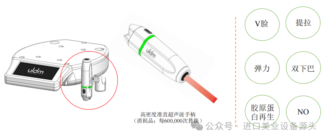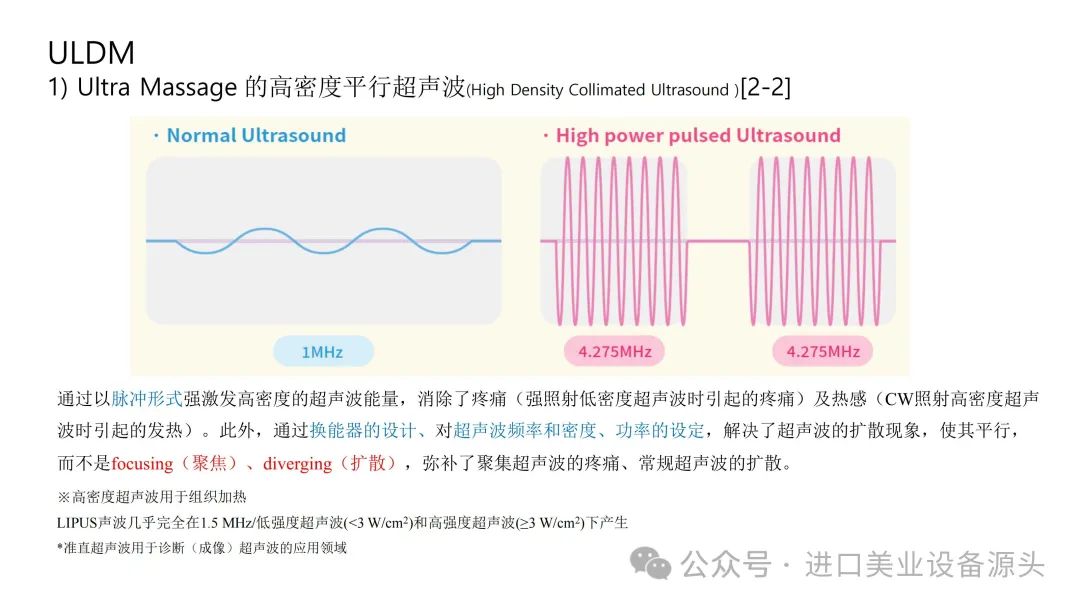 ULDM是首款兼具高密度平行超声波( 3.0 mm、4.5 mm )和四重波频(四通道:1、3、10、18MHz )超声波功能的多功能美容仪器。