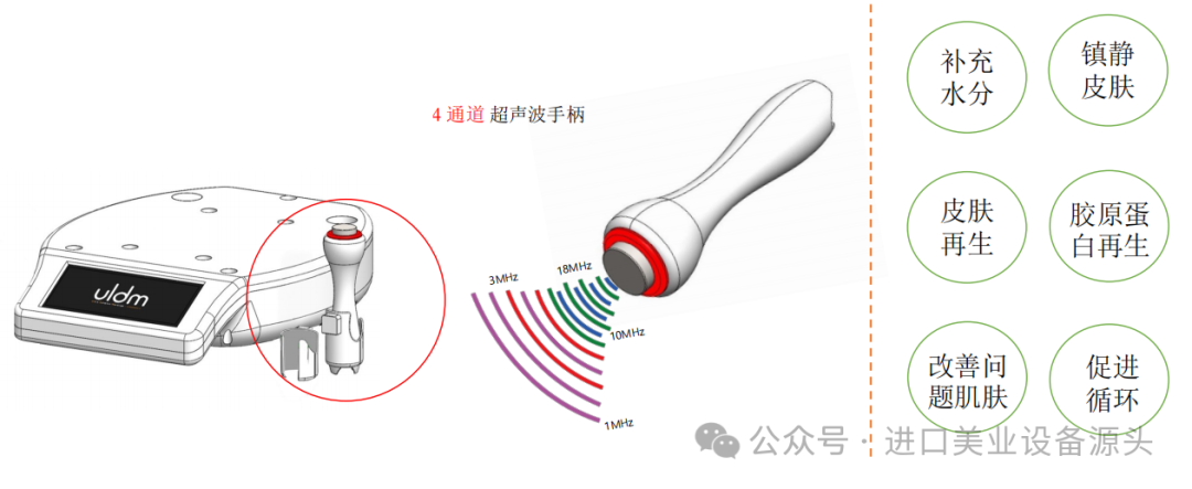 这是第一个结合了高密度并联超声波(3.0mm,4.5mm)和QUVE(4波长:1,3,10,18MHz)的超声波功能的多功能美容装置。