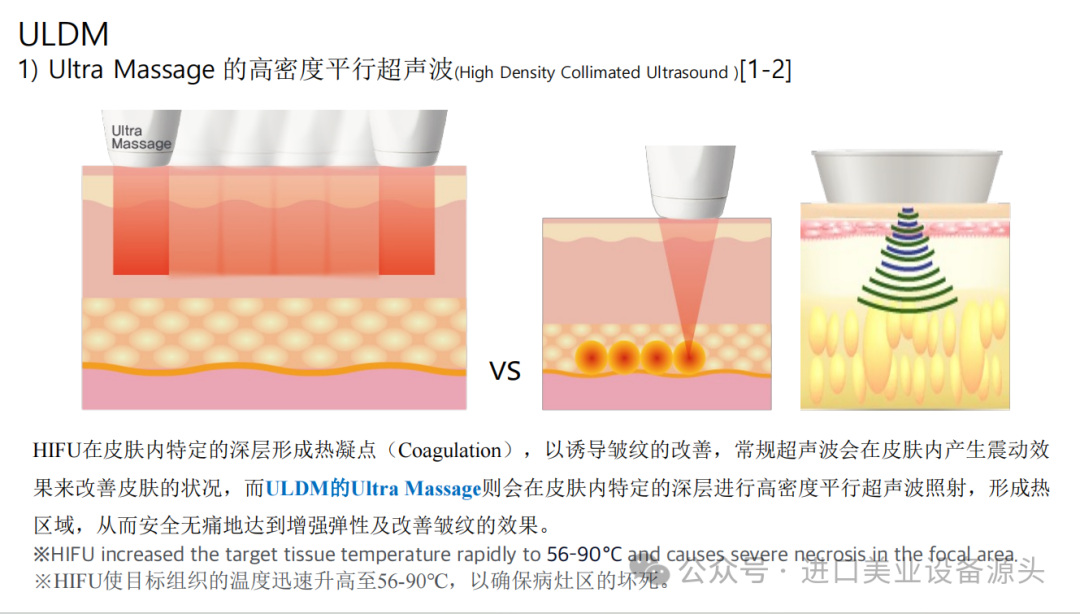 ULDM的超按摩通过投射高密度平行超声波到皮肤特定深处形成热区,从而安全无痛地改善弹性和皱纹。