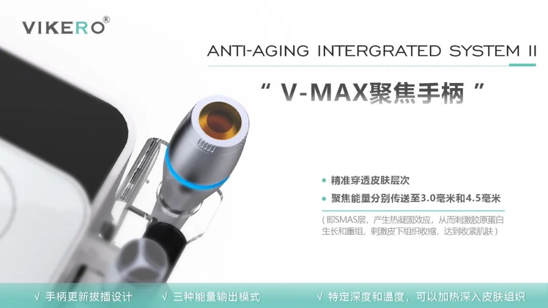 VIKERO AIS PRO 时间可以1~20分钟任意调节,能量强度自1~20调节,高级管理师可以根据管理需要和顾客的感受反馈等条件,合理进行设置,更加得心应手地运用仪器。还可以根据顾客年龄与皮肤衰老状态选择是否操作V-MAX4.5,建议25岁+选择3.0,35岁+3.0与4.5叠加操作。